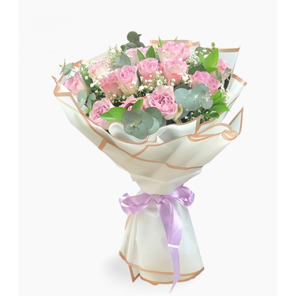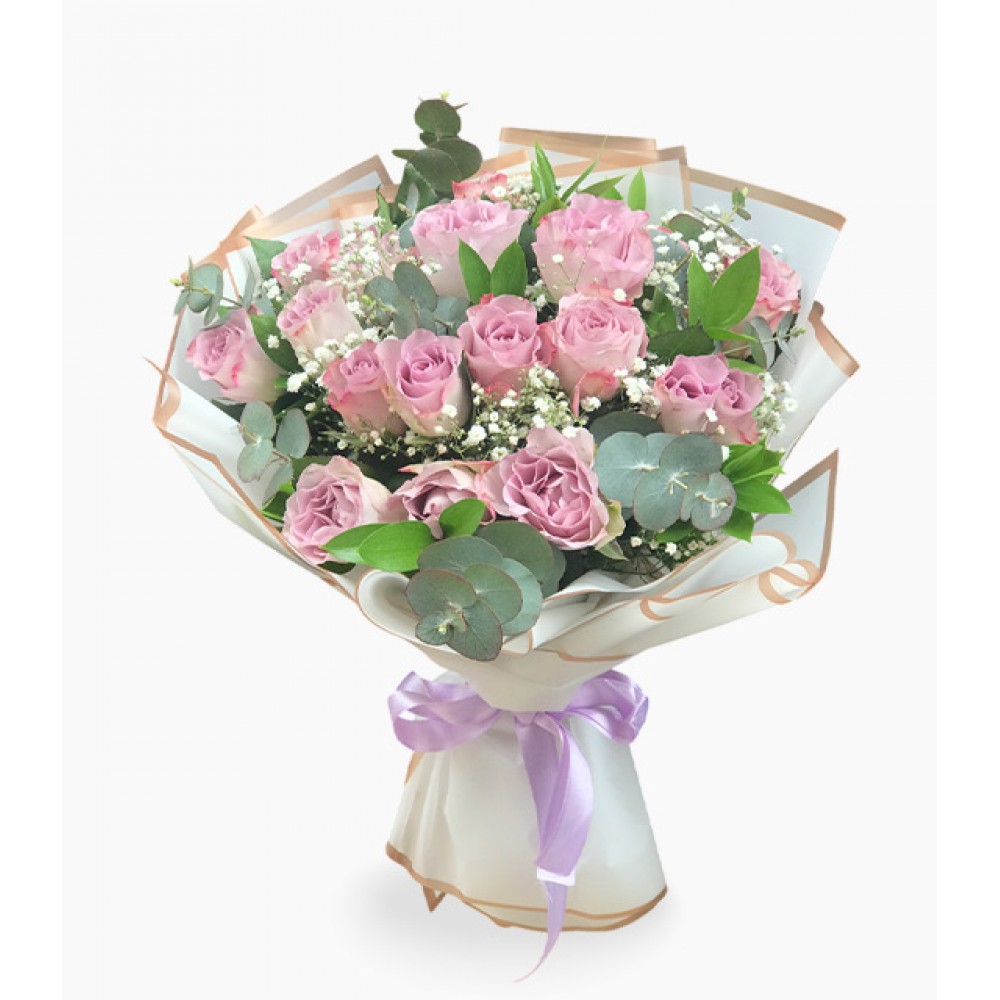 Cipsofilya ve yeşillikler ile hazırlanan beyaz fonlu 20 adet lila gülden oluşan gül buketi