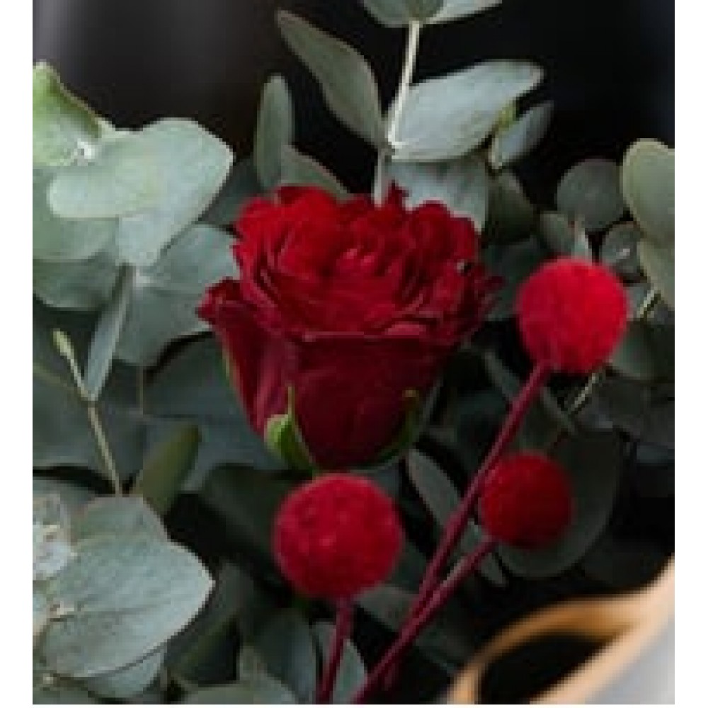 Ürün İsmi: Siyah Bukette Kırmızı Gül ve Kırmızı Craspedia