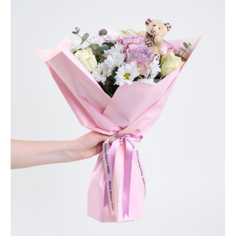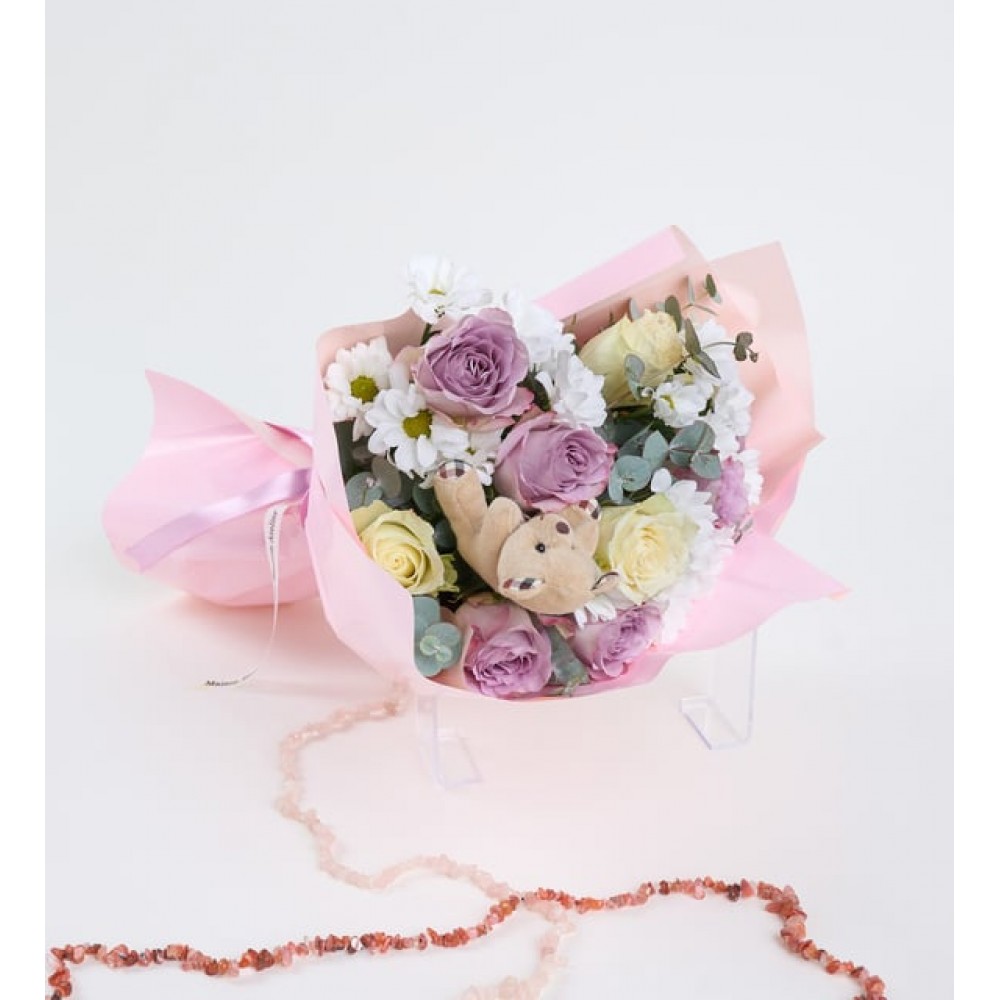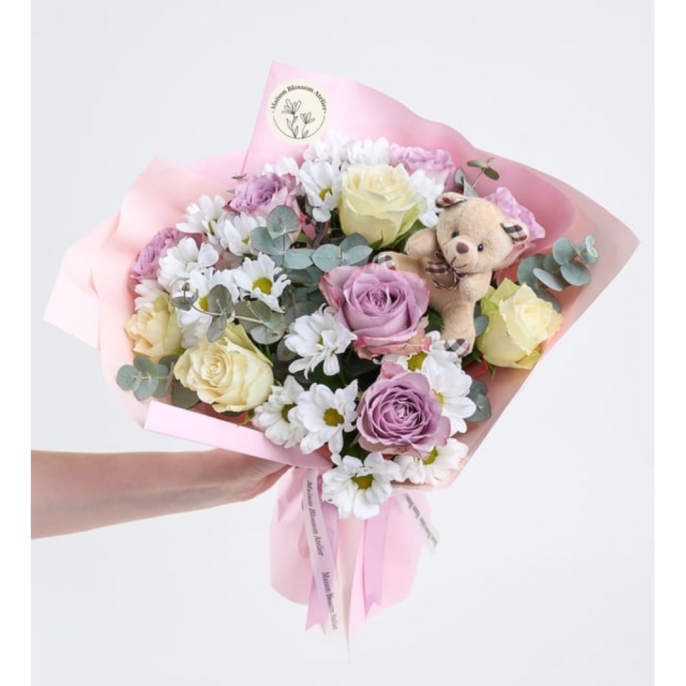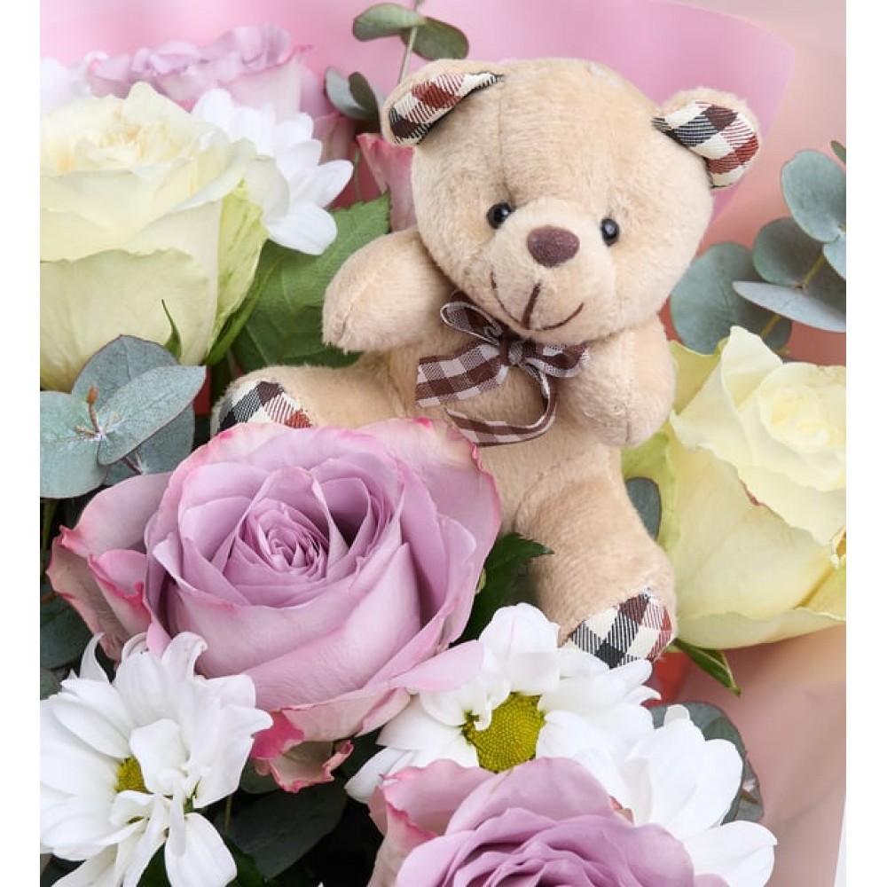 Aşkı ve sevgiyi anlatmanın birçok farklı yöntemi olsa da geçmişten günümüze çiçeklerin yeri bir başkadır. Çünkü çiçekler, kelimelerin ötesindeki duygulara da tercüman olabilir. Sevginizi ifade etmenin en zarif yolu; özel tasarımı ve pastel tonlarıyla dikkat çeken Pudra Bukette Lila Güller ve Ayıcık Anahtarlık aranjmanı! Lila güllerin büyüleyici güzelliği, beyaz güllerin safiyeti ve okaliptüs dallarının doğal dokunuşuyla harmanlanan bu şık aranjman, sevdiklerinizin yüzünde sıcacık bir gülümseme yaratacak.