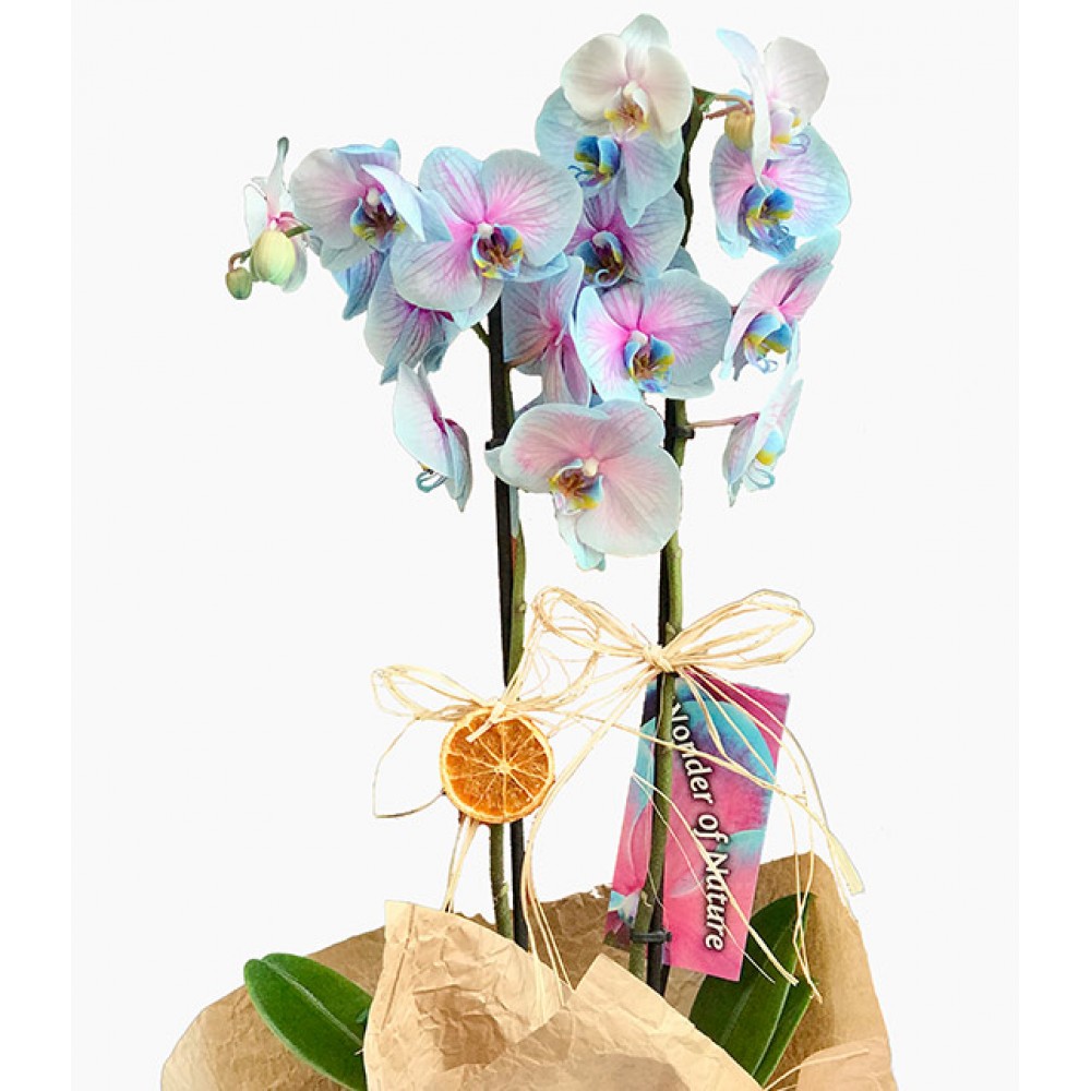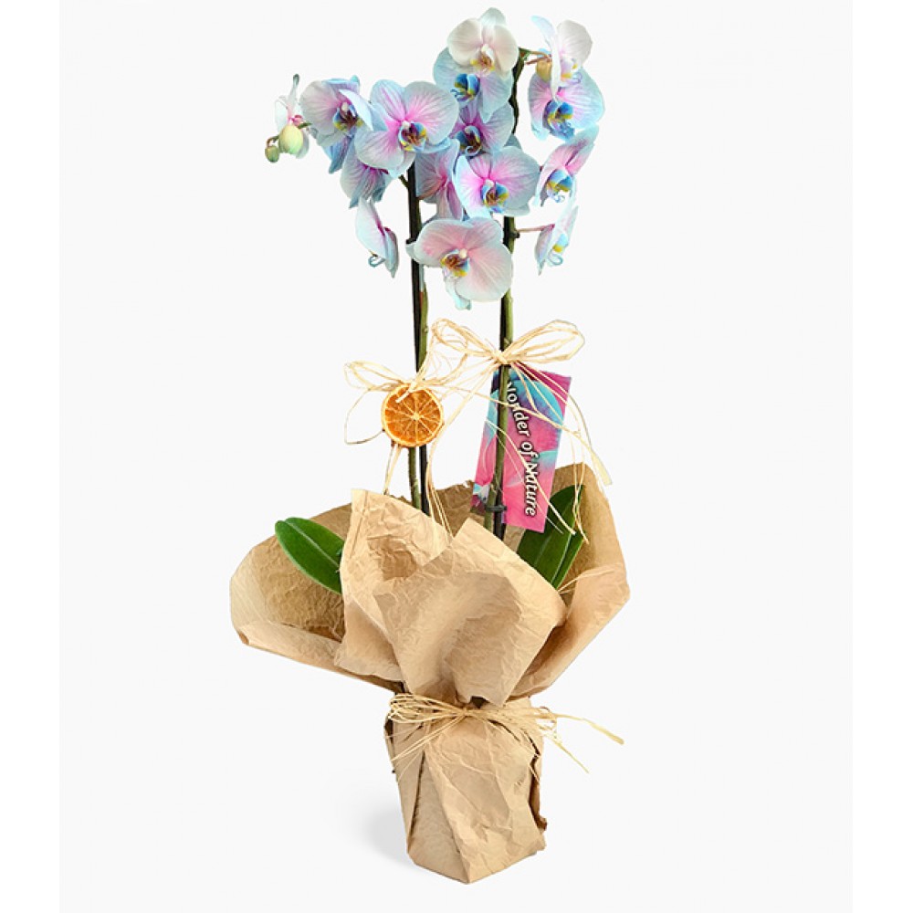 Doğal kağıtta sarılı İki dallı Wonder Blue Alacalı orkide çiçeği
