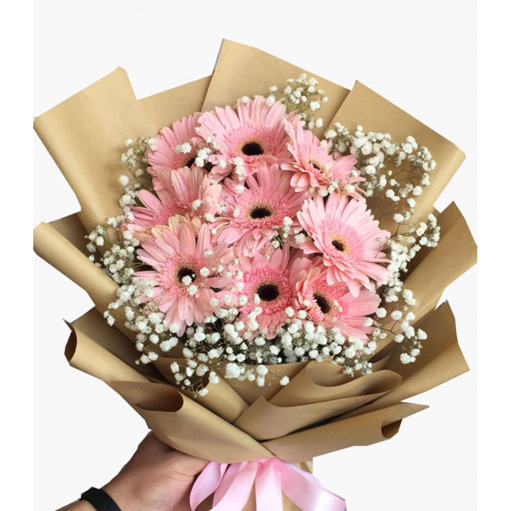 Cipsofilya ve pembe gerberalar ile hazırlanan çiçek buketi