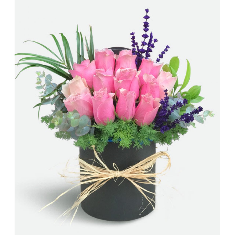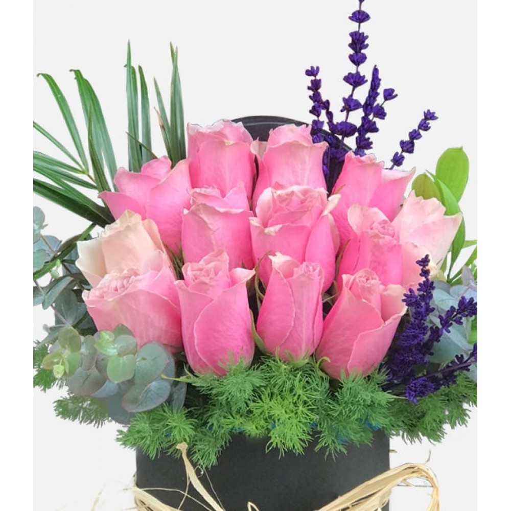 Yuvarlak siyah lkutuda pembe güller, dekoratif aranjman yeşillikleri ve lavanta ile hazırlanan canlı pembe gül aranjmanı.
