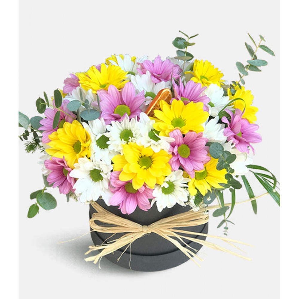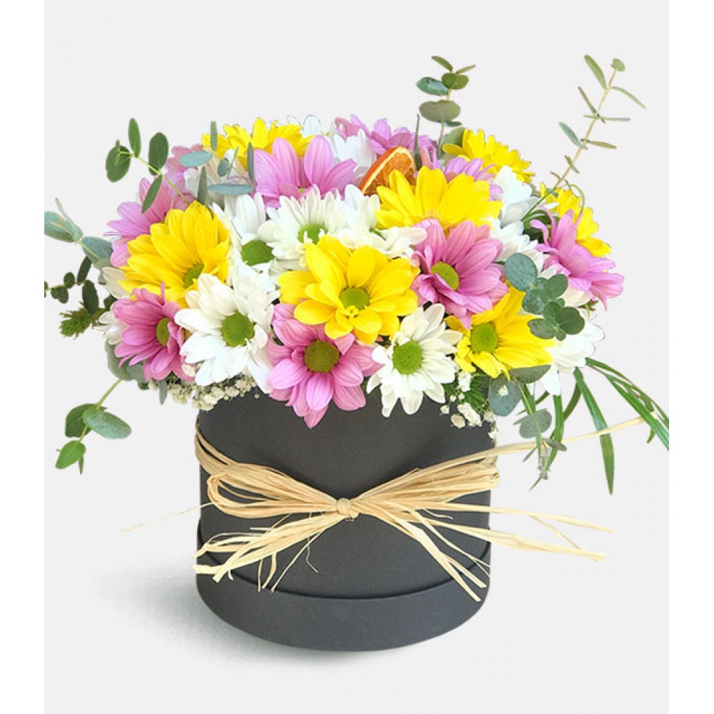 Sevginin en zarif haliyle buluştuğu bu özel çiçek aranjmanı, mekanlarınıza estetik ve zarafet katmak için tasarlandı. Siyah silindir kutusunun modern ve şık duruşu, renkli papatyaların zarafetiyle birleşerek muazzam bir görsellik sunuyor. Rafya kurdele ise aranjmanın tümüne asil bir hava katıyor, sevdiklerinize anlam dolu bir hediye seçeneği sunuyor. Hem şıklığı hem de doğallığı bir arada barındıran bu eşsiz aranjman, sevdiklerinizin kalbini kazanacak. Siparişiniz sonrasında çıkacak “Not oluşturma” sayfasında birkaç cümlelik not oluşturarak hediyenizi daha anlamlı bir hale getirmeyi unutmayın.