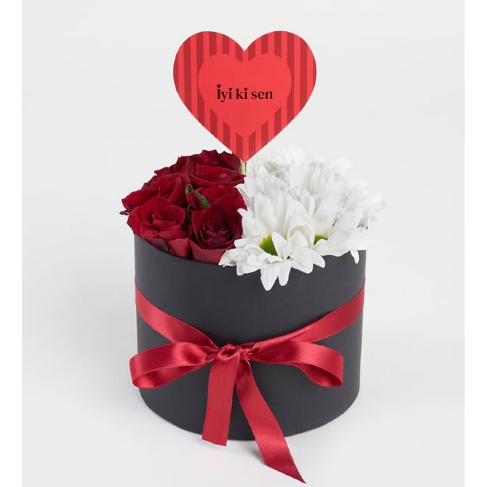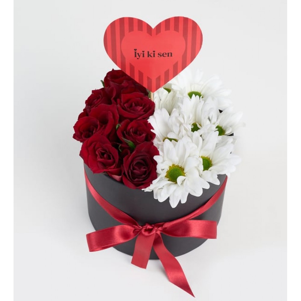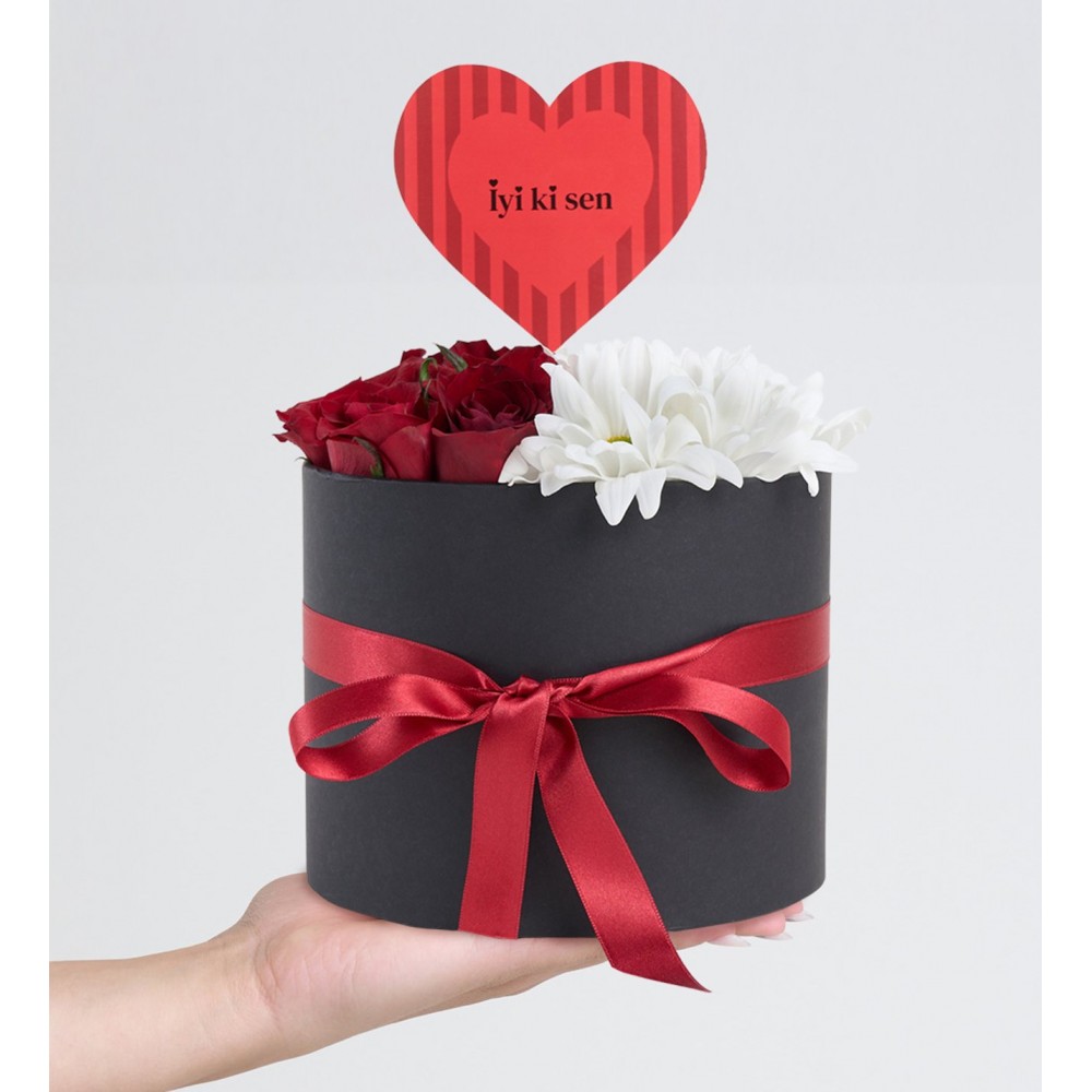 Özel anların en zarif ve anlamlı yansıması olarak tasarlanan Siyah Kutuda Kırmızı Güller ve Beyaz Papatyalar, duygularınızı en etkileyici şekilde ifade etmeniz için mükemmel bir seçimdir. Siyah silindir kutunun şıklığı ile bir araya gelen canlı kırmızı güller, aşkın ve tutkunun sembolü olarak kalplerde unutulmaz izler bırakır. Yanlarında serin ve saf beyaz papatyalar ise masumiyetin ve temiz duyguların ifadesi olarak bukete zarif bir dokunuş katar. Bu özel aranjman, sevdiğinize “İyi ki Sen” pankartıyla birlikte sunularak, ona hayatınızda ne kadar değerli olduğunu hissettirmenin en güzel yolunu sunar.