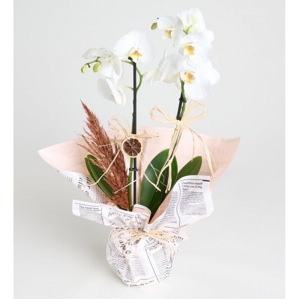 Ürün İsmi: Gazete Buket Kağıtlı Saksıda Beyaz Çiftli Orkide