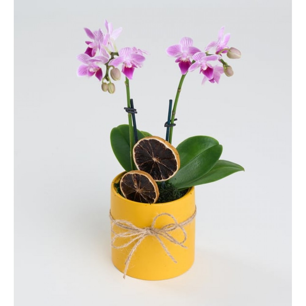 Ürün İsmi: Sarı Saksıda Çiftli Mini Mor Orkide Çiçeği