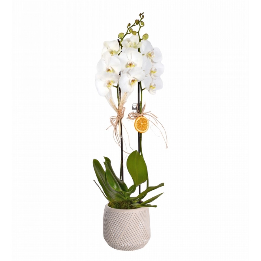 Bu ürün, kaliteli ithal orkidelerden oluşturulmuştur. Çiçeğin yaklaşık yüksekliği 50 - 60 cm boyutlarındadır.
