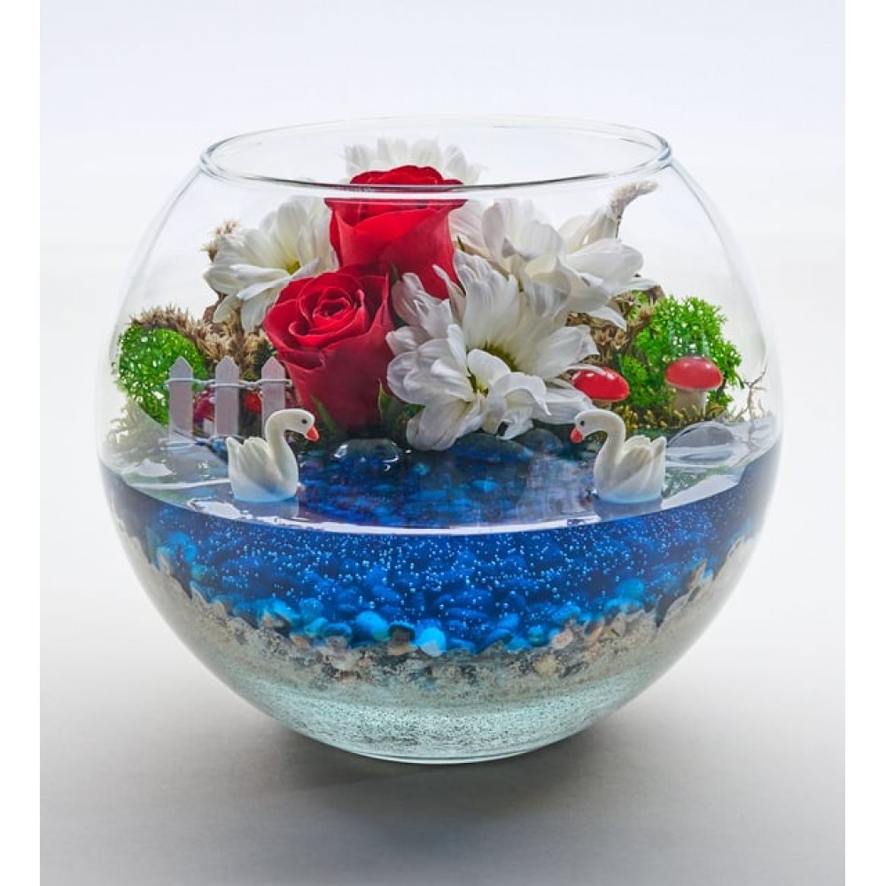 Cam fanusun içerisinde yer alan ağaç kabuğu, bahçe çiti, çakıl taşı, kuğu figürü, kum, mantar, mum jel, tatarika ve yosun gibi detaylar, teraryuma doğal bir atmosfer katarken, özel anılarınızı daha anlamlı kılacak bir aranjman ortaya çıkarır.