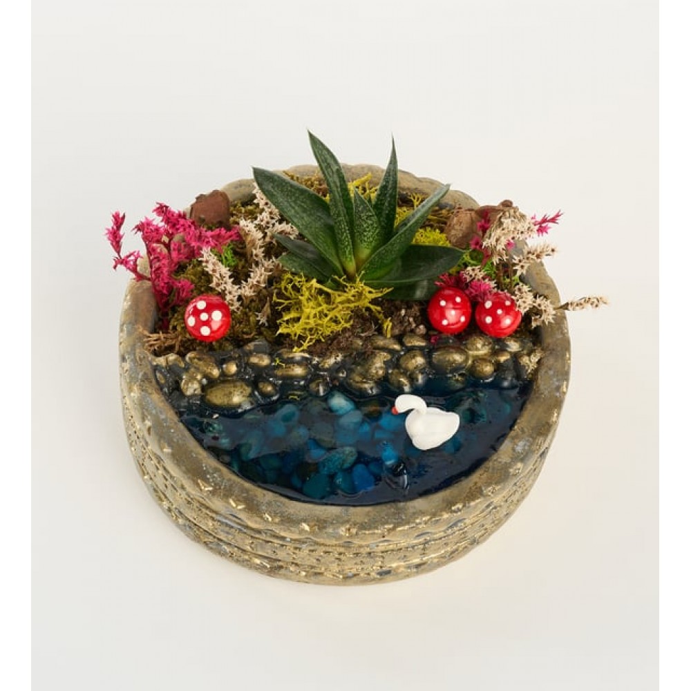 Özel tasarım ring saksıda bir araya gelen Haworthia bitkisi, eşsiz uyumu simgeliyor. Çakıl taşı, kuğu, kum, mantar, moss-dired, mum jel, tatarika, yosun, ağaç kabuğu, beyaz ve mor yapay bitkiler ile süslenen bu teraryum, benzersiz bir görünüme kavuşuyor.
